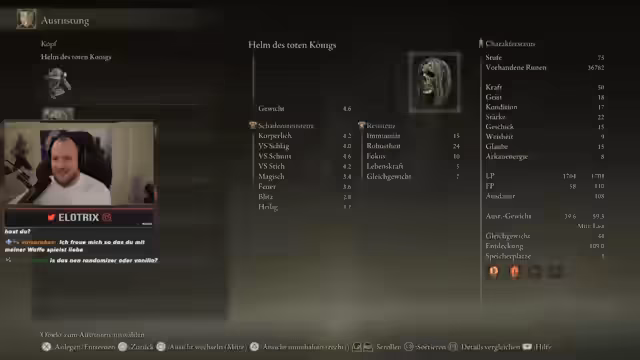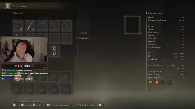 01:15:28Der Streamer testet Elden Ring selbst, um zu bewerten, wie schlecht Schradin ist. Er plant, Schradin nicht anzuschreien, sondern ihn bei Fehlern zu korrigieren. Um den Charakter playbar zu machen, sind erhebliche Anpassungen nötig. Dazu gehören das Einsammeln spezieller Items wie der Fürstenträne gegen Moog, Goldfüße für Runenfarm und Blasphemische Klinge, die das Besiegen der Schlange erfordert. Die Statverteilung wird als chaotisch und unzureichend für Tanking oder Waffenhandhabung kritisiert.