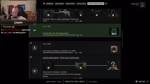 00:05:41Der Streamer begrüßt seine Zuschauer und äußert den Wunsch, im Battle Royale-Modus besser zu werden, wobei er auch die Möglichkeit in Betracht zieht, Arc Raiders zu spielen. Er erwähnt, dass er sich unterlevelt fühlt, da er Arc Raiders noch nicht viel gespielt hat. Es wird auch über die Qualität eines neuen Karabiners gesprochen, der zwar gut sei, aber eine störende Taschenlampe habe. Er überlegt, einen neuen Account für Arc Raiders zu erstellen oder seinen Main-Account dafür zu nutzen, um Trophäen zu sammeln und mit Freunden zu grinden. Allerdings sieht er Arc Raiders auch als ein Spiel, das man gut off-stream spielen könnte. Aktuell erledigt er einige tägliche Herausforderungen in seinem Spiel, wie das Erzielen von Kills mit der Schrotflinte.