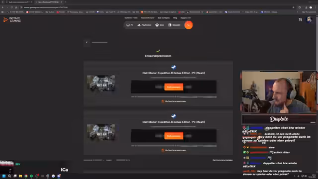 00:32:47Der Stream führt ein spontanes Gewinnspiel für Expedition 33 Deluxe Edition durch, nachdem aus Versehen ein zweiter Key gekauft wurde. Die Interaktion mit der Community steht im Vordergrund, während der Streamer sein Vertrauen in Instant Gaming ausdrückt und die gesparten Beträge über die Jahre teilt. Aragon88 wird als Gewinner bekannt gegeben.
