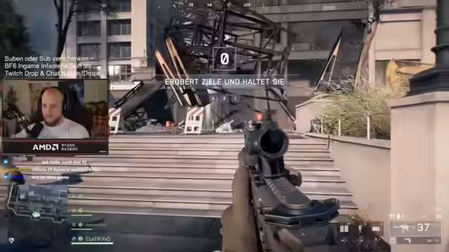 09:21:46Der Streamer lud die Community ein, dem Battlefield-Kanal auf seinem Discord beizutreten, um Mitspieler zu finden. Battlefield 6 wurde als unterhaltsam zum Zuschauen beschrieben, aufgrund der unterschiedlichen Spielstile wie狙击, Sturmgewehr-Helix und Hubschrauberflüge. Es gab wiederkehrende Muster im Gameplay wie Panzerkämpfe und das Verwenden von Heil- und Reparatur-Kits. Die Maps wurden als herausfordernd beschrieben, besonders bei der Jagd auf Sniper-Kills für Trophäen. Ein Problem mit der Raketenvisierung wurde angesprochen, das den Streamer frustrierte.