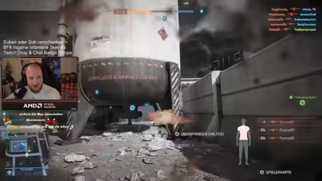 07:25:23Der Streamer kündigt an, dass der Stream weitergeht und noch eine Stunde Battlefield gespielt werden soll. Es wird erwähnt, dass nach der aktuellen Runde noch eine Werbung für AMD geschaltet werden muss. Der Streamer ist positiv gestimmt und freut sich auf weitere Spielzeit, auch wenn es gelegentlich zu technischen Problemen wie Crashs kommen kann. Der Chat wird für seine gute Laune gelobt.