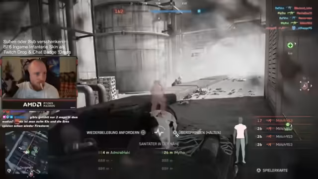 06:15:53Das Gameplay zeigt intensives Panzer-Combate. Ein Stryker wird eingesetzt, um gegnerische Pioniere auszuschalten, die Reparaturarbeiten an Panzern durchführen. Das Revive-System wird intensiv genutzt, um gefallene Teammitglieder schnell wieder ins Spiel zu bringen. Der Streamer betont die Wichtigkeit von Revives und wie diese das Teamspiel entscheidend beeinflussen können. Der Panzer selbst wird als Game-Changer bezeichnet.