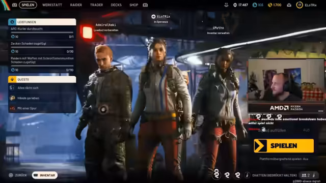 05:40:08Der Streamer plant, in der nächsten Runde eine lila Karte zu nutzen, betont aber, dass er dafür zuerst mit einem Gratis-Loadout entkommen muss, um den Schlüssel sicher in der Sicherheitstasche zu verstauen. Es wird empfohlen, den Veredler (eine Werkbank) zu upgraden, um höhere Ressourcen craften und Waffen verbessern und reparieren zu können. Die Menge an verschiedenen Items im Spiel kann anfangs überwältigend sein, aber es wird geraten, alles zu markieren, um wichtige Gegenstände leichter zu finden. Die Community zeigt sich sehr engagiert und gibt viele Tipps und Ratschläge. Es wird die Möglichkeit erwähnt, Nachtmissionen zu absolvieren, um zu looten und zu entkommen, ohne große Kämpfe zu suchen. Der Streamer plant, später noch Waffen in anderen Spielen zu leveln, um für zukünftige Battle Royale-Spiele besser vorbereitet zu sein, wobei er hofft, dass diese weniger Skill-basiertes Matchmaking haben. Die Freude über Teampartner, die nützliche Gegenstände finden, wird hervorgehoben.