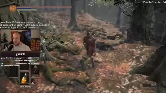 01:39:45Zu Beginn werden Soundeinstellungen im Stream angepasst. Die Lautstärke eines 44er Alerts wird erhöht und ein anderer Alert auf 150 Lautstärke gestellt. Gemeinsam mit dem Zuschauer Striker werden Gegenstände und Tauschmöglichkeiten in Dark Souls 3 diskutiert, darunter der Tausch von Feuerbomben gegen Titanitschuppen und die Benutzung von speziellen Waffen-Items, wie dem unendlichen Heilknochen, die das Gameplay erleichtern.