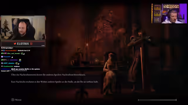00:57:26Es kommt zu einem ernsten Gespräch über angebliche Praktiken anderer Streamer. @schradin wird beschuldigt, von anderen Streamern dafür instrumentalisiert zu werden, dass diese bei gemeinsamen Watchpartys den gewonnenen Content für sich verwenden, um durch Bingo-Events Geld zu verdienen. Der Streamer relativiert dies, da es sich um Freunde handele. Anschließend wird die Vorbereitung für einen Bosskampf besprochen, bei der @schradin angewiesen wird, abzusteigen und seine Waffenfähigkeit statt des Pferdes einzusetzen.