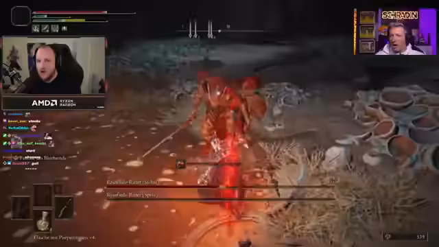 02:44:27Der Streamer fordert Schradin auf, nun aktiv zu kämpfen und nicht nur zu rollen. Er soll sich dem Boss stellen, ihn unter Druck setzen und erst bei niedriger Lebenspunkt zurückziehen. Radahn beginnt, mit Kometenangriffen zu arbeiten, was die Kampfkomplexität erhöht. Schradin gelingt es, Radahn zu treffen, aber der Kampf bleibt holprig. Der Streamer redet Schradin mutig zu und fordert ihn auf, sich zusammenzureißen und die Angriffe des Bosses zu kontern.