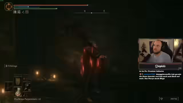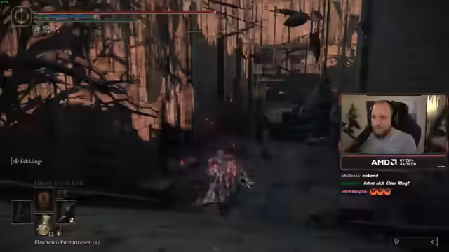 00:11:54Der Streamer kämpft sich durch das DLC-Gebiet und stellt fest, dass er mit dem Chicken-Leg-Waffe, die im Old-Patch besonders stark ist, extrem hohen Schaden verursacht. Er erklärt die Mechanik: Ein aufgeladener schwerer Angriff verursacht Blutung, und mit dem passenden Talisman wird der Schaden nach einer erfolgreichen Blutung nochmals um 30% erhöht. Diese Kombination beschreibt er als absolute 'Kinderverarsche'. Trotzdem stoßen Bosse wie ein Nilpferd auf Widerstand, da die Haltung nicht immer gebrochen wird.