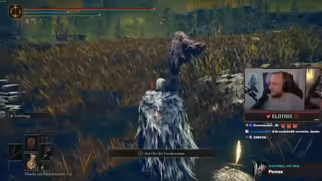 01:56:41Der Stream setzt den Chicken Leg Run in Elden Ring fort. Der Streamer erkundet eine neue Area und sammelt Fragmente eines Skado-Baums ein. Im Dialog mit dem Chat tauchen Themen wie ein bevorstehender Herr der Ringe-Marathon und die Handlung von Breaking Bad auf. Die allgemeine Stimmung ist entspannt, wobei der Streamer gelegentlich über den anstrengenden Level-1-Run spricht, den er für heute jedoch auf Eis gelegt hat, um sich auf den spaßigeren Chicken Leg Run zu konzentrieren.