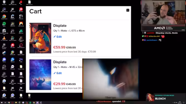 00:14:27Ein Zuschauer meldet, dass der Rabatt-Command für Displate nicht funktioniert. Der Streamer bittet die Moderation, den 38%-Rabatt ab drei Displays zu überprüfen. Er berichtet, dass sich jemand aus der Chefetage von Displate bei seinem Management gemeldet habe, um nachzufragen, was er über die Rabattaktion verbreicht habe. Die Aktion am Freitag war so erfolgreich, dass in 24 Stunden 950 Displays bestellt wurden, was zu einem Peak im System und großem Interesse führte.