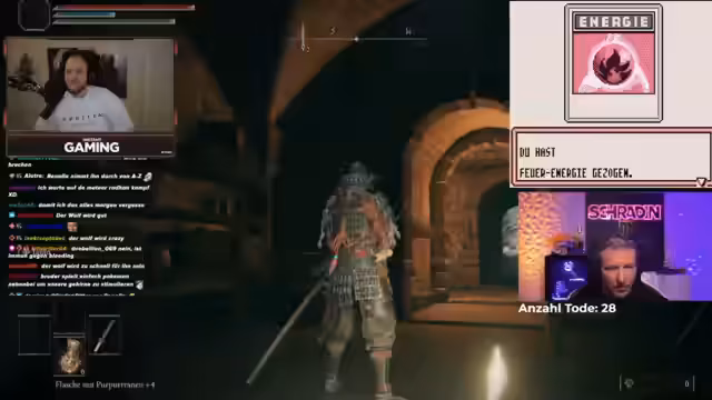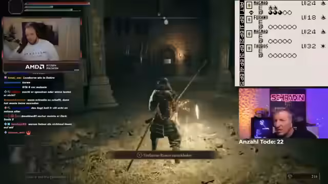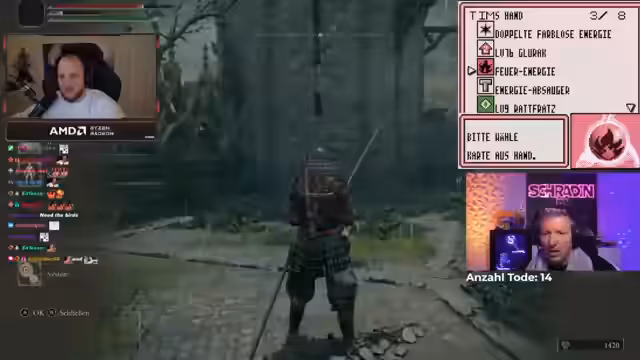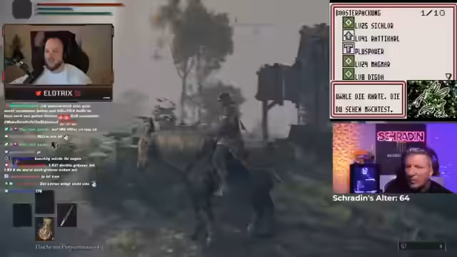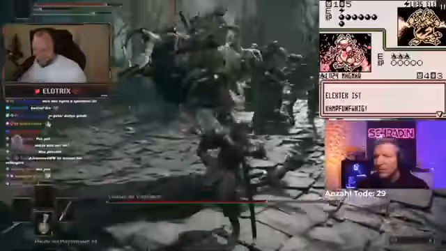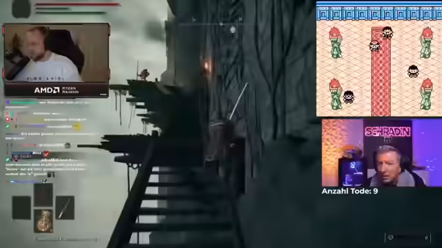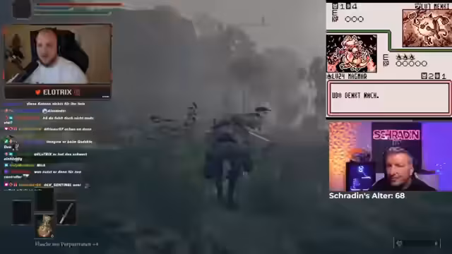 00:08:09Die Watchparty mit 'Schradin' beginnt, der 'Elden Ring' spielt und über 24.000 Zuschauer hat. Währenddessen interagiert der Streamer mit seinem eigenen Pokémon-Spiel auf dem Game Boy Color, was eine bemerkenswerte Doppelbeschäftigung zeigt. Es kommt zu technischen Anpassungen bei der Camera-Anordnung, um die Pokémon-Simulation über der Cam des anderen Streamers zu platzieren. Der Streamer kommentiert das Gameplay von Schradin kritisch und stellt fest, dass dieser trotz seines Builds immer noch Schwierigkeiten mit den Gegnern hat und einen 'Crash-Out' erleidet, was auf eine mentale Überforderung hindeutet.