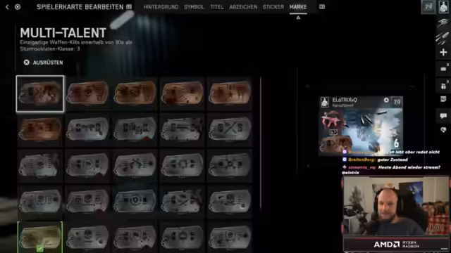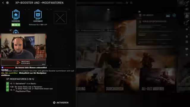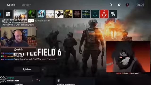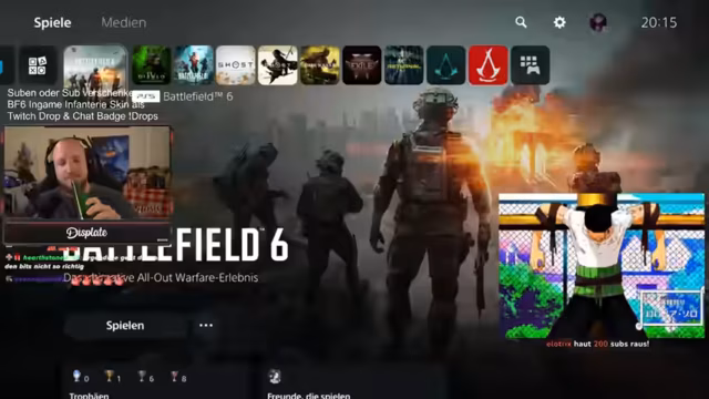 00:10:13Der Streamer begrüßt die Zuschauer zu einem langen Samstagabend mit Battlefield 6. Er erwähnt, dass er den Green Falcon Skin als Twitch-Drop erhalten hat und sich diesen noch abholen muss. Er erklärt, wie man Twitch-Drops für Battlefield erhält: Man muss sich bei seinem EA-Konto anmelden, Twitch verknüpfen und das Konto der Plattform, auf der man Battlefield spielt (PlayStation, Xbox oder PC), verbinden. Er hat alle seine Drops abgeholt und plant, heute Abend ein Sturmgewehr freizuschalten, den Karabiner weiterzuleveln und tägliche sowie wöchentliche Aufgaben für zusätzliche Erfahrungspunkte zu erledigen. Das Hauptziel des Streams ist es, Level 80 zu erreichen, da er aktuell Level 69 ist.