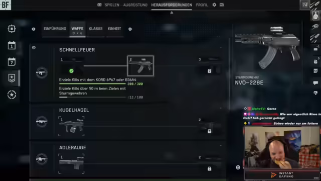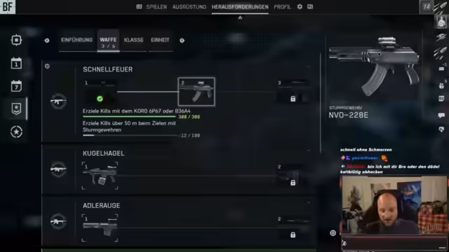01:40:04Ein Spieler entscheidet sich, die SRM 5 zu testen und hochzuleveln, da es ihm Spaß macht, neue Waffen im Spiel auszuprobieren. Er plant, noch in derselben Nacht 100 Long Range Sturmgewehr-Kills zu erzielen, um das letzte Sturmgewehr freizuschalten, das er seit Battlefield 3 schätzt. Die NVO wird als sehr starke Waffe in der Beta bezeichnet, aber die 100 Longshot-Kills über 50 Meter werden als mühsam empfunden. Die Kord wird als „AEK aus Belfi 3“ beschrieben, die stark ist und mit den richtigen Aufsätzen auch auf Distanz gut funktioniert. Es werden auch Herausforderungen für Double XP besprochen, wie das Abschließen von Team Deathmatch und das Erobern eines Ziels in einem Fahrzeug. Die Spieler sind motiviert, diese Herausforderungen zu meistern, um schneller im Level aufzusteigen. Die Menüführung des Spiels wird als katastrophal empfunden, was die Navigation durch die verschiedenen Modi erschwert. Trotzdem herrscht eine positive Einstellung zum Leveln und Ausprobieren neuer Spielweisen.