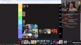 01:00:41Auf Initiative des Chats wird ein gemeinsames Serienranking erstellt. Der Streamer und die Viewer bewerten verschiedene Serien in Kategorien von A+ bis F. Persönliche Favoriten wie Game of Thrones und Breaking Bad werden in die höchste Kategorie A+ eingestuft, während Dexter ebenfalls als A+ bewertet wird, da der Streamer dessen Neustart freut. Serien wie Narcos und The 100 werden ebenfalls positiv bewertet, während andere wie Elite oder Blacklist als durchschnittlich eingestuft oder abgebrochen werden.