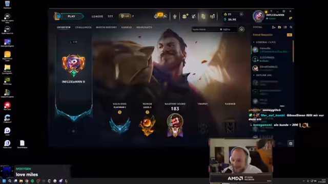 00:05:22Der Stream startet mit einem gemütlichen Abendgruß. Zunächst stehen technische und inhaltliche Vorüberlegungen im Fokus. Der Streamer spricht über seine Erfahrungen mit verschiedenen Lanepositionen, da Midlane seine Anfänge waren, er aber aufgrund seiner anfälligen Laning-Phase in den Jungle wechselte. Dies wird als natürliches Entwicklungsschema für viele Spieler beschrieben. Anschließend tauscht er sich mit der Community über seine aktuellen Freizeitaktivitäten aus, darunter das Spielen von Elden Ring und der Genuss von Serien wie Sons of Anarchy.
