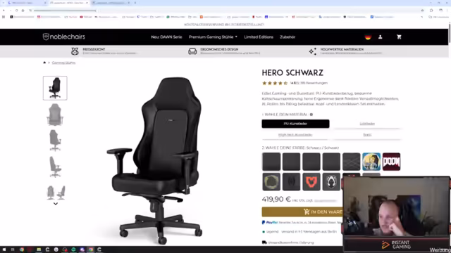 03:07:17Der Streamer nutzt den Stream, um seinen langjährigen Partner Noble Chairs zu bewerben. Er hebt hervor, dass der Hersteller normalerweise kaum Rabatte anbietet, weshalb die aktuelle Reduktion der Legend Silver Edition von 450 auf 300 Euro als besondere Ausnahme gilt. Er preist die hohe Qualität und Langlebigkeit der Stühle und empfiehlt insbesondere die Fußablage als 'Game Changer' für den Komfort, auch wenn die Produkte im oberen Preissegment angesiedelt sind.