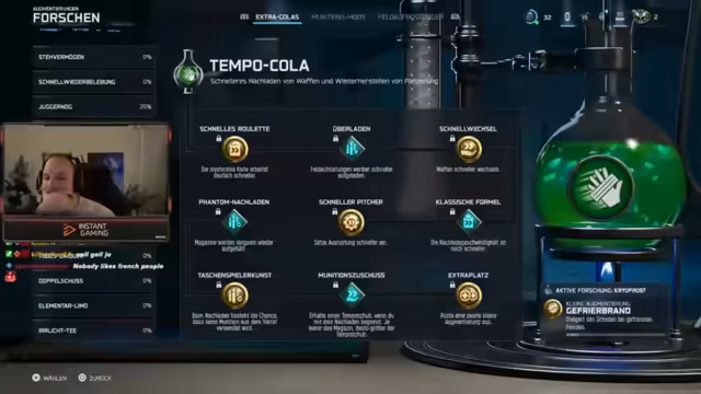 07:08:44Elotrix und Mytho setzen ihre Diskussion über die besten Perks und Strategien im Zombies-Modus fort. Elotrix plant, Hirnfeule weiter zu erforschen, um die Abklingzeit zu reduzieren, und überlegt, welche Tempo-Cola-Upgrades am sinnvollsten sind, insbesondere die Chance, beim Nachladen keine Munition aus dem Vorrat zu verbrauchen, was er als „voll OP“ für Wunderwaffen empfindet. Auch die schnellere Arbeitsweise der mysteriösen Kiste und die schnellere Aufladung von Feldausrüstungen sind interessante Optionen. Sie sprechen über die Schwierigkeit, 100 Kills nach Feldausrüstung zu erzielen und wie man dies mit einer Ulti und Insta-Kill am besten erreicht. Elotrix hat viele Ultra-Kaugummis gesammelt, darunter „Nahtoderfahrung“ und „Wunderwaffe“. Sie planen, eine letzte schnelle Runde zu spielen, und Elotrix möchte die „Mirage“ testen, um das Visier „Lethal Tools Elo“ freizuschalten, das er als das beste Rotpunkt-Visier empfiehlt. Er kritisiert die Unpräzision der „Friedensstifter“ und die unlogischen Aspekte von Call of Duty, wie die fehlenden Nachteile von erweiterten Magazinen im Zombies-Modus und die unrealistische Kampagne. Elotrix erwähnt, dass er fast alle Waffen auf Gold hat und nur noch fünf fehlen. Er muss für die vorletzte Camo 10 Bären pro Waffe töten, also insgesamt 300 Bären, was er als „räudig“ empfindet. Er überlegt, wie er diese Herausforderung am besten meistert, eventuell durch das Wiederholen von Runden mit vielen Bären mithilfe von Runden-Kaugummis. Er erinnert sich an die extrem zeitaufwendige Zombie-Camo-Herausforderung in Black Ops 4, die ihn damals abgeschreckt hat.