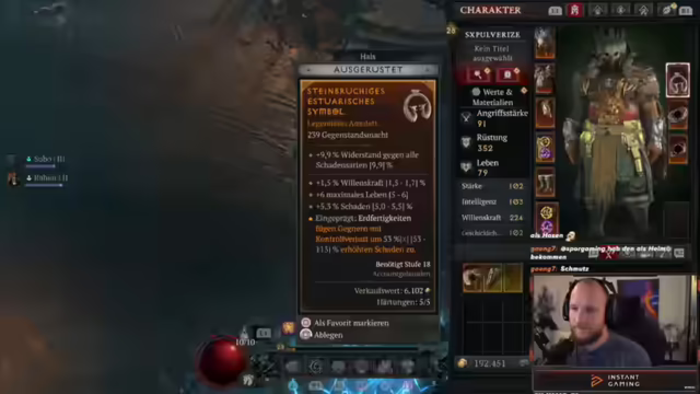 04:30:51Elo findet sein erstes Unique-Item, eine Brustrüstung, die ihm dauerhaft die Werbär-Gestalt verleiht. Dadurch hat er immer die Boni als Bär, wie Tankiness und mehr Leben. Elo ist begeistert vom Loot in dieser Season. Er stellt klar, dass er ein Unique und kein Mythic gefunden hat. Dieses Unique hätte er auch in einem anderen Slot finden können. Elo will nun Eisenpelz weiterleveln, da er durch die Brust immer in Werbär-Gestalt ist. Er stellt fest, dass die Höllenflut sehr gut läuft. Elo bedankt sich bei einem Zuschauer für ein Jahr Restart. Er stellt fest, dass er gar nicht mehr die ganzen Ressourcen ausgeben kann, wenn es so weitergeht. Elo erklärt den Unterschied zwischen Unique und Mythic-Items. Er sucht nach einem OP-Amulett mit perfekten Rolls. Elo hat nun 16% Schadensreduktion und kann noch einen Punkt reinstecken. Er geht gleich zum Baum. Elo findet das Amulett eigentlich perfekt, da es Bewegungsgeschwindigkeit und Ressourcen gibt. Er muss nun das Sloan- vielleicht auf den Ring kriegen. Elo stellt fest, dass alle Werbeerfähigkeiten nun plus zwei Ränge haben.