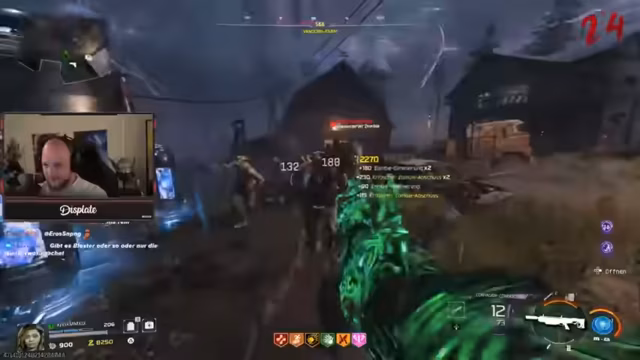 06:42:35Der Streamer startet eine Solo-Runde auf der kleinen Map, um die neu erforschten Fähigkeiten und Waffen zu testen. Es wird die Möglichkeit entdeckt, Solo-Spiele zu speichern, was als 'geil' empfunden wird, auch wenn der Spielstand nach 30 Tagen verfällt. Während des Spiels werden die Vorteile des Messerns von Zombies für zusätzliches Geld und die Nutzung des 'Mülleimers' zum Verkaufen unerwünschter Waffen für Schrott diskutiert. Die Effektivität der Shotgun und die Suche nach einer 'Raygun' als Wunderwaffe stehen im Vordergrund. Die Zombie-Tarnungen, insbesondere 'Zombies Dark Matter', werden als optisch ansprechend erwähnt und die Möglichkeit, diese auch im Multiplayer zu nutzen, wird als besonderer Anreiz gesehen. Die Unpräzision der Shotgun wird kritisiert, aber die Freude am Zombie-Modus bleibt bestehen.