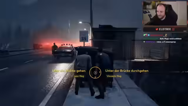 00:50:39Der Streamer startet mit dem Koop-Spiel "A Way Out" gemeinsam mit Carsten. Sie agieren als ein Team, das aus dem Gefängnis ausbrechen will. Während des Spiels gibt es ständige Interaktion und verbale Auseinandersetzungen zwischen den Spielern, die auf einem festgelegten Spielstil basieren. Sie koordinieren sich, um Wachen auszuschalten und versteckte Wege zu nutzen, wobei es gelegentlich zu Komplikationen bei der Synchronisation kommt.