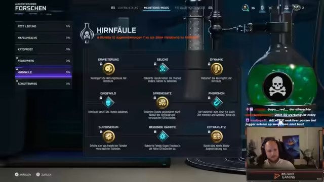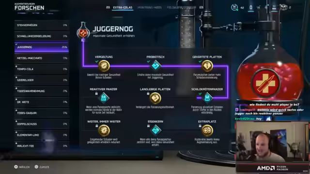 05:55:12Nach einer intensiven Spielrunde, die bereits sechs Stunden dauert, wird der Fortschritt der Spieler analysiert. Ein Spieler hat Level 41 erreicht und Akita freigeschaltet. Es wird spekuliert, welche neuen Zombie-Maps in Zukunft hinzugefügt werden könnten, wobei die Hoffnung auf die Rückkehr von „Eisendrache“ geäußert wird. Die Forschungsergebnisse zeigen, dass 25 % der wichtigen Perks freigeschaltet wurden, darunter Jugger-Knock und Panzerplatten, die mehr Schadensminderung bieten. Die Spieler lesen sich die Beschreibungen weiterer Perks durch, wie die Giftpflanzen, die Feinde verlangsamen und Gesundheit überladen können, was als „Todes-OP“ empfunden wird. Die Vorteile von doppelten Ladungen bei Fähigkeiten werden betont. Die Diskussion dreht sich auch um die Effektivität verschiedener Munitions-Mods und Aufsätze für die Shotgun, um den Schaden und die Reichweite zu maximieren.