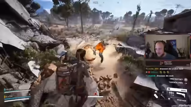 04:23:46Die Spieler stoßen auf eine mächtige Maschine namens Material-Chen. Zunächst ist unklar, wie man mit ihr umgehen soll, doch es wird entschieden, sie anzugreifen, um Materialien zu sammeln. Der Kampf eskaliert, als die Maschine giftige Projektile abfeuert und neue, feindliche Maschinen spawnen. Ein Leaper, eine gegnerische Einheit, wird gesichtet. Währenddessen kommt es zu einem plötzlichen Angriff durch menschliche Gegner, die sich in der Nähe befinden. Die Spieler geraten unter Beschuss und müssen sich in Deckung begeben, während sie versuchen, die Situation zu analysieren und die Angreifer zu lokalisieren.