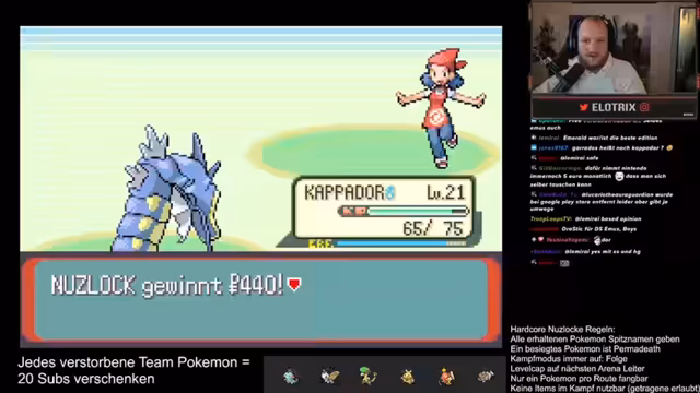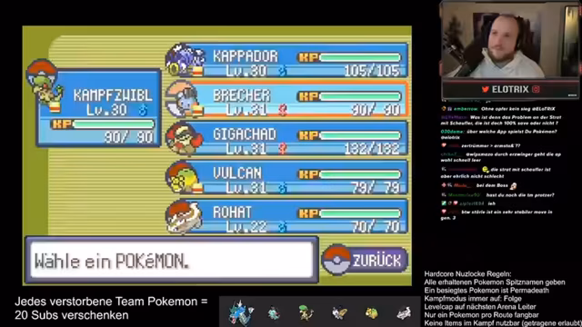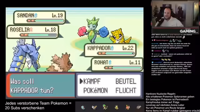 17:24:06Nach dem Sieg über die Flug-Arena wird das Level-Cap auf 42 angehoben, was eine längere Trainingsphase ermöglicht. Der Streamer muss nun seine Teammitglieder wie Garados und den Starter auf das neue Niveau bringen. Es werden Überlegungen angestellt, welches Pokémon welche Attacken erlernen sollte. Erdbeben für den Starter wird als wichtig erachtet, während für Garados Donnerblitz als optionale Attacke diskutiert wird.