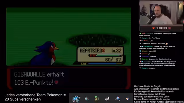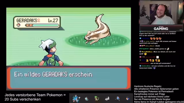 13:36:49Der Streamer gibt eine Spenderaktion bekannt, in der er 40 Abonnements verschenken wird, sobald er einen 40-Run im Chat sieht. Die Community reagiert humorvoll und der Streamer sammelt Spenden. Nach der Aktion geht es weiter mit den Nuzlocke-Regeln. Der Streamer fragt in den Chat, welches Pokémon er gegen Geradex einsetzen soll und erhält verschiedene Tipps, darunter Egelsamen und Couples, um den Kampf sicher zu gestalten.