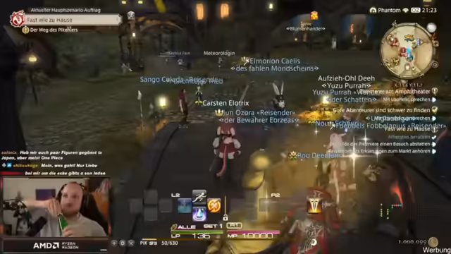 02:51:55Der Streamer begegnet zufällig bekannten Spielern auf dem gleichen Server und interagiert mit ihnen. Er zeigt verschiedene Charaktere und ihre Ausrüstungen, darunter eine Figur mit einer Sense und eine Katzenfrau. Es entstehen interessante Gespräche über Spielmechaniken und Loot-Systeme. Der Streamer erkundet die Stadt Gridania, nimmt Quests an und versucht sich in der Steuerung des Spiels zurechtzufinden. Er erwähnt auch die Schwierigkeiten bei der Orientierung ohne vergrößerte Karte.