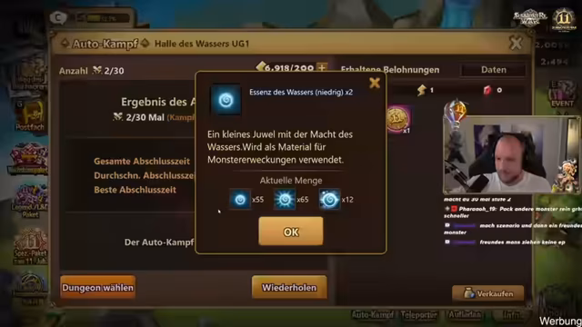 02:37:44Zu Beginn des Streams beschäftigt sich der Streamer intensiv mit dem Farmen von Runen und Monster-Erweckungen in Summoners War. Er äußert Frustration über das langsame Leveln eines speziellen Monsters, trotz intensivem Farming in Dungeons wie Festung der Riesen. Er erläutert den Prozess des Erweckens, der voraussetzt, dass ein Monster Maxlevel hat und man es in der Monsterliste auswählen muss. Dabei geht er auf benötigte Materialien, wie Essenz des Wassers, ein und diskutiert die optimale Vorgehensweise, um das Monster effektiv zu leveln und zu erwecken.