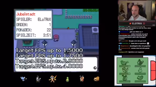 09:27:01Der Streamer konzentriert sich intensiv auf die Freundschafts-Entwicklung seines Pflanzenstarters Knospi, um dessen Entwicklung auszulösen. Er erläutert die Mechanik, dass sich das Pokémon höher auf dem Bildschirm schwebt, je mehr Freundschaft es hat, und testet dies, indem er mit ihm spricht. Gleichzeitig bereitet er den Besuch in der Pokémon-Arena vor und klärt im Chat, ob das Pokémon in Kämpfen gegen normale Trainer oder nur gegen Arenaleiter Freundschaft gewinnt, um den Prozess effizient zu gestalten.