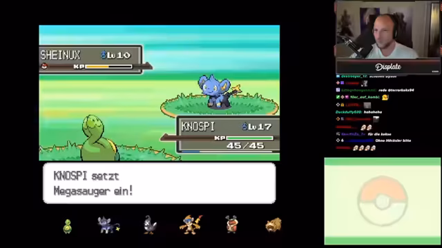 04:13:44Der Streamer steigt in die ersten Kämpfe gegen wilde Pokémon und Trainer ein. Er analysiert die Movesets der Gegner, wie das wild Glut, und testet deren Attacken. Ein Highlight ist das Auffinden eines seltenen Pokémon, das nur an bestimmten Orten erscheint. Der Chat gibt wertvolle Tipps zur Nutzung des PokéNavs und zu den Tageszeiten, die bestimmend für das Auftreten mancher Pokémon sind. Das Spiel wird für seine schönen Details wie die Interaktion mit NPCs und die Kampfmusik gelobt.
