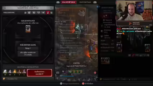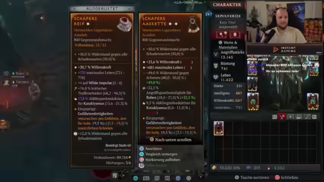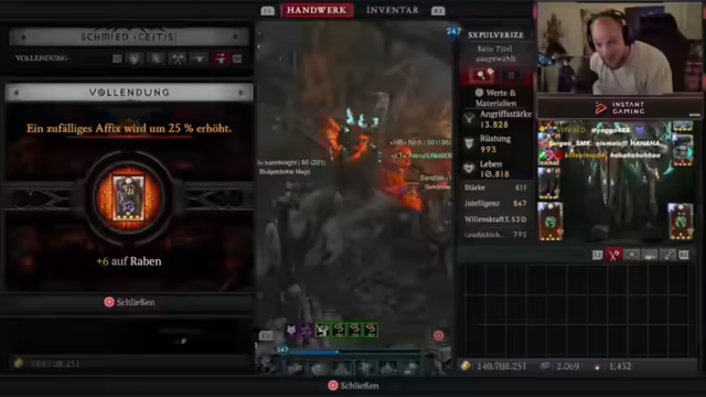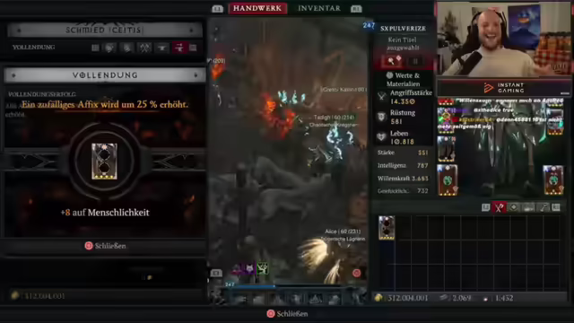 03:44:58Der Streamer spricht über verschiedene Aspekte von Diablo 4, einschließlich bevorzugter Battlefield-Teile, wobei Battlefield 3 und 4 hervorgehoben werden. Es wird über die Bedeutung von Max-Ressource für bestimmte Builds diskutiert und die Frage aufgeworfen, ob sich dies negativ auswirkt. Der Streamer erwähnt, dass er noch nie einen Greater Affix auf Kernfertigkeiten oder das Main-Attribut von Pulverisieren gesehen hat. Es wird ein Call für Spieler mit trüben Kristallemängeln gegeben, Legionsevents zu nutzen, um einen 800er-Stack zu erhalten. Der Streamer gibt Einblicke in die eigenen Crafting-Strategien, einschließlich des Verfeinerns von Items und des Ausgleichens von Stats wie Willenskraft durch das Rollen von Leben auf Ringen. Es wird erklärt, wie man sich Leader-Items selbst craften kann, indem man Tribute der Harmonie farmt und Runen verwendet, um mythische Items herzustellen. Es wird die Möglichkeit erwähnt, Runen zu favorisieren, um sie nicht versehentlich zu zerkraften, und das Umcraften von legendären Items, um die benötigten sechs Dinger zusammenzubekommen. Der Streamer teilt seine Erfahrungen mit dem Craften eines Kopfschmucks in Season 9 mit einem Triple-Grader-Arfix auf Movement Speed, Glückstrefferchance und Crit. Es wird die Inspiration durch ein YouTube-Video erwähnt und die Anpassung von Buildplänen an die eigenen Items.