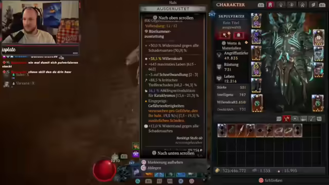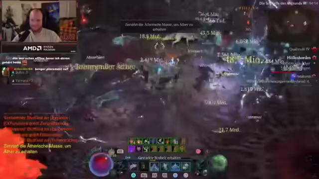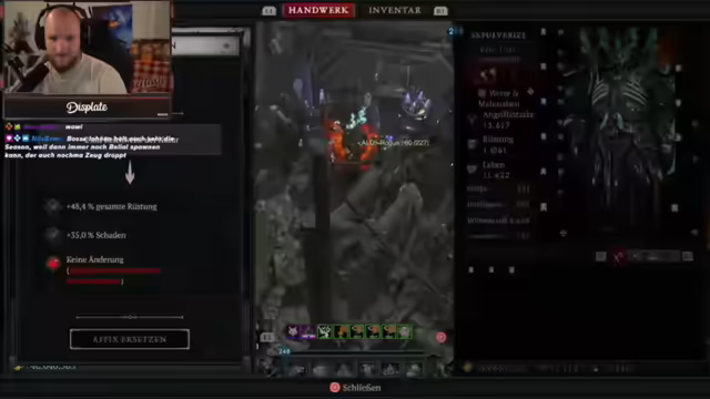 02:49:00Der Streamer äußert seine Begeisterung für Diablo 4 und dessen kontinuierliche Weiterentwicklung. Er plant, bald zu Battlefield zu wechseln, nachdem er ausgiebig Diablo gespielt hat. Es wird über die Trophäen in Battlefield gesprochen und die Hoffnung geäußert, dass Battlefield 6 ähnliche Herausforderungen bieten wird. Der Streamer teilt seine Strategie für das Erreichen bestimmter Trophäen in Battlefield 2042 und gibt Tipps, wie man diese effizient boosten kann. Es wird die Seltenheit bestimmter Items im Spiel hervorgehoben, insbesondere das Mythic-Attribut, das der Streamer trotz langer Spielzeit noch nie gefunden hat. Der Streamer äußert seine Sucht nach Diablo und plant, weitere Boss-Muts zu absolvieren, bevor er zu Battlefield wechselt. Er freut sich über seinen aktuellen Build und plant, in Zukunft einen neuen Build mit der Versteinern-Ulti auszuprobieren. Es wird über die Unterschiede zwischen Diablo und anderen Spielen wie WoW diskutiert und betont, dass Diablo ein Dungeon-Crawler ist. Der Streamer analysiert, wie er seinen Schaden weiter erhöhen kann, indem er bestimmte Items mit Greater Affixes findet und seine Hose als Chaos-Item optimiert. Er experimentiert mit verschiedenen Aspekten und passiven Fähigkeiten, um seinen Build zu perfektionieren, und tauscht sich dabei mit dem Chat aus.