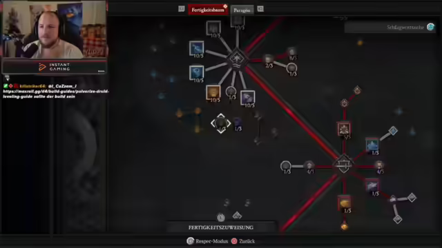 01:35:41Der Streamer erklärt die zentrale Fähigkeit des Druiden, die einen zusätzlichen Gefährten ermöglicht und den Schaden mit Gefährten erhöht. Die Chaos-Season-Fähigkeit macht Gefährtenfähigkeiten zu Kernfertigkeiten, wodurch die Raben keine Abklingzeit mehr haben und gespammt werden können. Der Ring sorgt während der Ulti für keine Ressourcenkosten und 40% mehr Damage. Ein Drop mit Greater Affix auf Willenskraft und Bewegungsgeschwindigkeit wird als sehr gut bezeichnet. Um die Ulti dauerhaft aktiv zu halten, wird auf Lucky Hit-Chance und längere Dauer im Skillbaum gesetzt. Der Streamer überlegt, Punkte aus der Ulti-Dauer zu entfernen und stattdessen in Damage zu investieren. Er sucht nach Möglichkeiten, den Schaden weiter zu erhöhen, z.B. durch Greater Affix auf Kern oder Überwältigungsschaden. Auch Angriffsgeschwindigkeit ist nicht schlecht, da sie die Tickrate der Raben und Blitze erhöht. Die Hose wird als Chaos-Item mit Greater Affix auf Raben und Chance auf doppelten Schaden gewünscht.