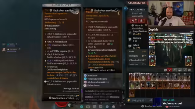 03:34:49Der Streamer zeigt seinen starken Schaden im Überwältigungs-Build und ist davon begeistert. Er stellt aber auch fest, dass das Build für Bosskämpfe ungeeignet ist, da es keine Crowd-Control-Fähigkeiten besitzt. Er beschreibt die Frustration, durch einen Build-Wechsel seine Vorteile durch das Season-Thema zu verlieren. Er erklärt, warum er den schnelleren Raben-Druide dem langsameren Pulverisieren-Druide vorzieht, trotz der hohen Schadenszahlen des letzteren.