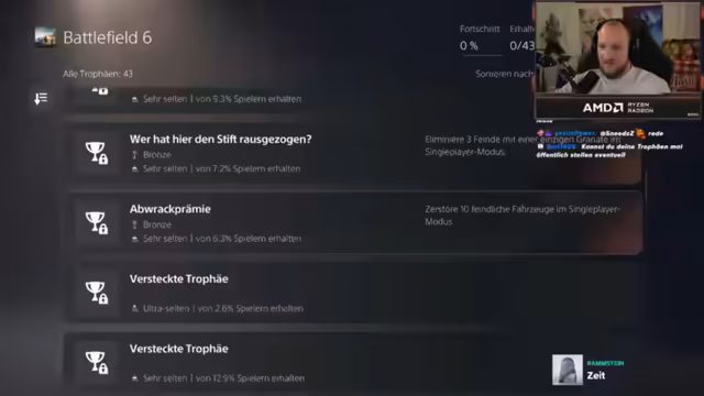 03:59:54Der Streamer spricht über seine Erfahrungen mit Battlefield 5 und 2042, wobei er Koop-Trophäen als besonders schwer, aber lohnend beschreibt. Er erwähnt, dass er auf seinen Teamkameraden Ehrenbruder Striker, Dan und Pagami vertraut. Bei der Diskussion über die schlimmsten Platin-Trophäen nennt er The Evil Within und Black Ops 4, speziell den Zombie-Modus, der extrem viel Zeit und Mühe erfordert.