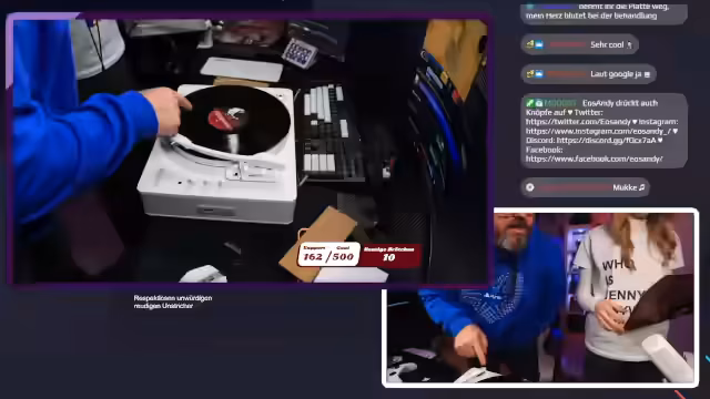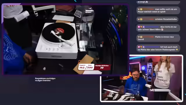 03:01:44Jenny präsentiert einen neuen Plattenspieler im Holz-Look, der sofort auf großes Interesse stößt. Die Inbetriebnahme gestaltet sich jedoch als Herausforderung, da die richtige Handhabung der Platte und des Geräts zunächst unklar ist. Es wird diskutiert, wie man die Platte richtig auflegt, die Geschwindigkeit einstellt und die Nadel platziert, um Kratzer zu vermeiden. Die Frage nach der Seite B und der Reihenfolge der Lieder auf der Platte wird aufgeworfen. Die automatische Start-Stopp-Funktion des Plattenspielers wird erklärt, und es wird festgestellt, dass man nicht vorspulen kann, sondern das Lied von Anfang bis Ende anhören muss. Die Musik, die direkt von der Nadel kommt, sorgt für Verwunderung, und es wird über die Notwendigkeit eines Deckels zum Schutz und zur Geräuschdämmung gesprochen. Trotz einiger Schwierigkeiten und der Erkenntnis, dass Plattenpflege aufwendig ist, wird der Plattenspieler als cool empfunden. Die Diskussion über die Lagerung des Plattenspielers und die Umständlichkeit des Plattenhörens im Vergleich zu digitalen Medien rundet die Vorstellung ab.