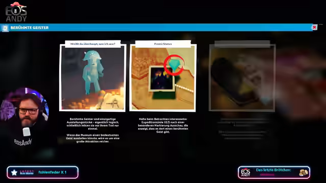 03:27:46Die Verwaltung der Geister erweist sich als schwierig, da viele unzufrieden sind und nur einen geringen Wohlfühlfaktor aufweisen. Lösungen umfassen das Hinzufügen von Automaten und Dekoration, das Anbringen von Infotafeln und das Umpflanzen der Geister in besser passende Zimmer. Trotz vieler Bemühungen stagniert die durchschnittliche Begeisterung bei 62-64 Prozent. Es wird überlegt, neue Geister auf Expedition zu schicken, um deren zuverlässige Bedürfnisse zu erforschen und die Begeisterung der Exponate weiter zu steigern.