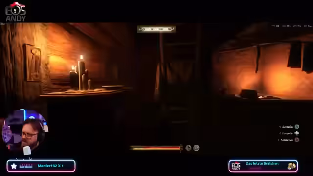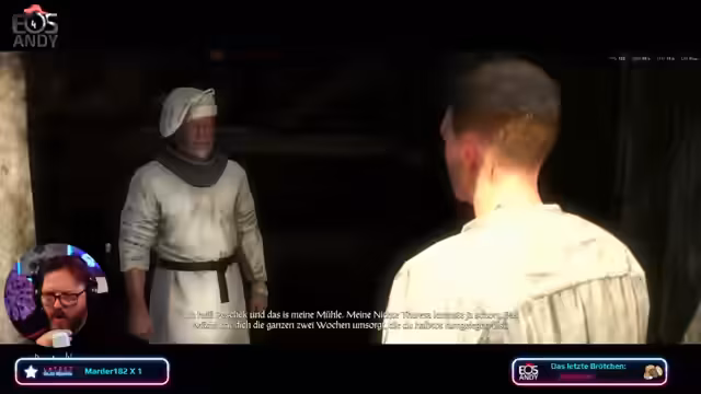 04:37:37Als das Spielende und die Nacht näher rücken, wird die fehlende Fackel zum zentralen Problem. Der Spieler kann sich im Dunkeln kaum orientieren und ist gezwungen, auf der Burg oder bei Müller-Pesek übernachten. Es wird festgestellt, dass die Nachtzeit das Spiel unmöglich macht, da der Spieler ohne Beleuchtung nichts erkennen kann. Dies führt zu Frust und dem Entschluss, das Streamende zu früh zu beenden.