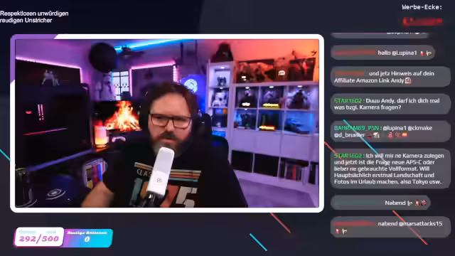 00:27:25Der Streamer beginnt den Abend mit der Vorstellung seiner neuen Beleuchtung, die er als „genormte Lichter in China“ bezeichnet, und demonstriert die Sprachsteuerung für seine Stream- und Regallichter. Er erwähnt, dass er die Lichter über sein Geschäftskonto bezogen hat, da sie zur „Stream-Raum-Ausstattung“ gehören. Ein Zuschauer fragt nach Kameraempfehlungen, woraufhin der Streamer rät, für Landschafts- und Urlaubsfotos eher eine neue APS-C-Kamera statt einer gebrauchten Vollformatkamera zu wählen. Er betont, dass man keine Vollformatkamera benötigt, um gute Fotos zu machen, und verweist auf moderne APS-C-Modelle wie die R50 von Canon. Zudem spricht er über Akkus für seine R5 Mark II, die einen hohen Verbrauch hat und nicht alle Funktionen mit bestimmten Akkus unterstützt.