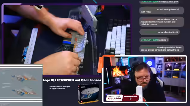 03:17:12Aktuell spielt der Streamer wieder Red Dead Redemption 2, jedoch anders als das erste Mal. Er konzentriert sich weniger auf die Missionen und erlebt die Geschichte entspannt. Beim Lego-Bau des USS-Enterprise-Modells macht er Fortschritte und erkennt das fertige Modell, einen Traktorstall, erst nach längerer Zeit. Er bevorzugt den Bau großer Steine, da man schnell sichtbare Ergebnisse hat. Er erwägt, das fertige Raumschiff an der Decke aufzuhängen, um Platz zu sparen und Staubprobleme zu umgehen.