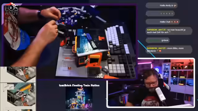 00:18:35Der Streamer startet mit dem Aufbau des Klemmbausteins-Modells, das vermutlich ein Zug oder eine Station ist. Er arbeitet nach den Anweisungen der Baupläne und stellt fest, dass Teile wie F und S fehlen. Die Musik wird auf Synthwave umgestellt, um eine entspannte Atmosphäre zu schaffen. Dabei entstehen erste Probleme mit drehbaren Elementen, die ein Rätsel darstellen. Der Streamer erklärt, dass er bereits etwas am Vortag gebaut hat, aber in einem komplexen Teil steckengeblieben ist. Der Chat hilft, während er betont, dass für das Ende der Bauphase noch Zeit benötigt wird.