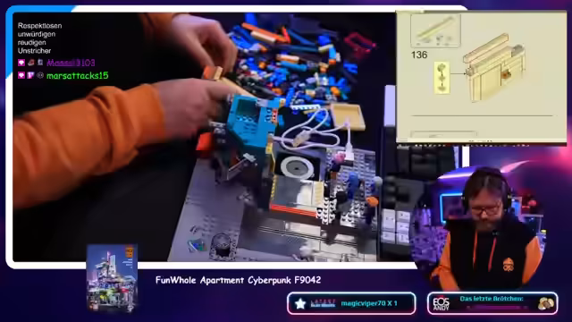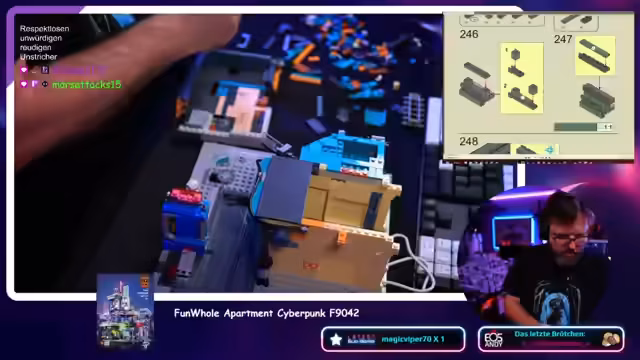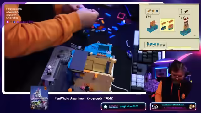 00:19:05Der Streamer erwähnt, dass er von einem Zuschauer Bilder eines fertiggestellten Hauses sah und das Bauen sehr anfixt hat. Zuerst stellt er jedoch ein neues Klemmbaustein-Set vor, das dem Cyberpunk-Stil nachempfunden ist. Nachdem er einen Download für ein anderes Spiel abgebrochen hat, packt er aus und ist von der Detailtreue des Sets sehr angetan. Besonders die Funktion eines Rolltors fasziniert ihn.