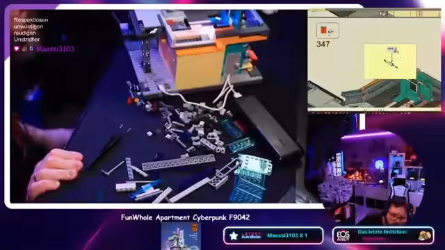00:01:02Der Stream beginnt mit dem Zusammenbau eines Klemmbausteinsatzes, bei dem der Streamer auf mehrere unerklärliche Probleme stößt. Er erwähnt, dass eine Garage abgefallen ist und ein Tor durchgerollt ist, was ihn verwirrt und verärgert. Trotz anfänglicher Verwirrung gelingt es ihm, die Garage und das Tor zu reparieren und alles leuchten zu lassen, was den Erfolg der Bauphase bestätigt.