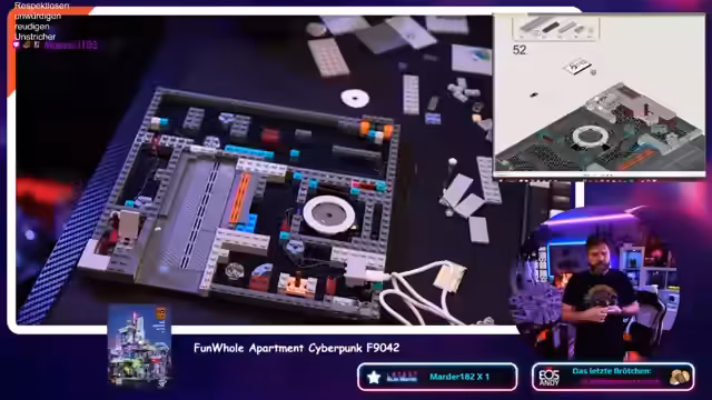 05:44:47Die Dunkelheit im Inneren des Sets wird bemängelt, obwohl ein Lämpchen vorhanden ist. Das Cyberpunk-Design mit wackelndem Licht wird gelobt. Es wird überlegt, ob die Grundplatte in ein IKEA-Regal passt. Der Streamer vermutet, dass die Größe dafür optimiert wurde. Es werden Spielfiguren verteilt. Ein Koch wird im Set platziert. Es wird über mögliche Pläne für die Gamescom gesprochen, eventuell wieder in Kooperation mit Ubisoft. Der Streamer reserviert sich Zeit für die Gamescom, auch wenn er nicht für eine Firma arbeitet. Es wird die Hassliebe zur Gamescom erwähnt. Das Bauset wird als gute Investition gelobt, da es Spaß macht und gut aussieht. Der Streamer räumt den Tisch auf, um Platz für City Skylines zu schaffen. Es wird festgestellt, dass viele große Teile übrig geblieben sind, was Sorgen bereitet. Der Streamer überlegt, das Set mit einer Powerbank zu betreiben.