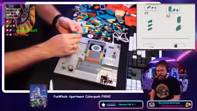 04:34:24Der Bau der zweiten Etage beginnt, wobei ein kurzes Kabel Sorgen bereitet. Es wird festgestellt, dass viele Steine übrig bleiben. Der Zusammenbau gestaltet sich weiterhin knifflig, insbesondere das Anbringen eines Ventilators. Die Farbe Türkis wird gelobt. Es wird festgestellt, dass die Farbe einen unterschiedlichen Härtegrad hat. Der Streamer scherzt über seine Fähigkeiten als Klemmbausteinmeister, die er von seiner Tätigkeit als Kunststoffformgeber ableitet. Es wird ein Problem mit der Helligkeit der Kamera festgestellt. Der Eingang zur Garage wird entdeckt und die Vorfreude auf das passende Auto geäußert. Neue Teile, darunter Stromleiter und eine Bank, werden verbaut. Die Helligkeit der Beleuchtung wird angepasst. Es wird festgestellt, dass die Tür falsch eingebaut wurde.