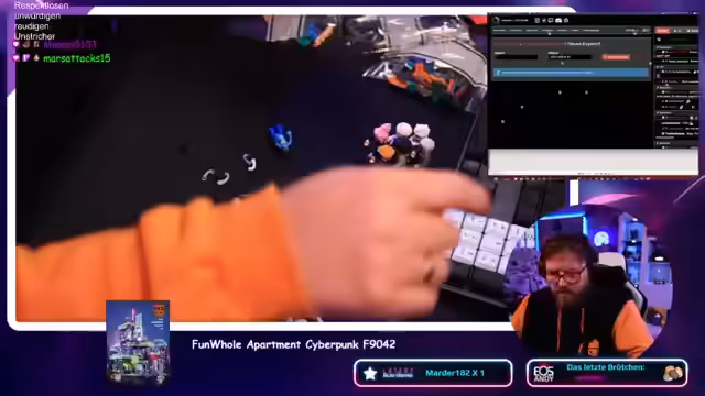 03:43:35Es wird ein Hoodie ausgezogen, da es warm ist. Es wird über alte T-Shirts und den Bauchumfang gesprochen. Es wird über Kalorienverbrennung durch Klemmbaustein-Power gesprochen. Es wird die tägliche Sportroutine beschrieben, bestehend aus Steppen, Sit-ups und Hanteltraining. Es wird erwähnt, dass es heute 15 Grad warm ist. Es wird ein Teil aus der Tüte F benötigt. Es wird über den Zusammenbau eines anderen Dings gesprochen, das immer wieder auseinanderfällt. Es werden kleine Räume erwähnt, die man zwischen Bücher stellt. Es wird über Ravensburger Puzzle und Lego gesprochen, die früher die einzigen Bastel-Dinger waren. Es wird über Laser-Cutter-Geschichten gesprochen. Es wird erwähnt, dass die Steine bis auf den Hasen geduldig verbaut werden. Es wird passende Cyberpunk-Musik gespielt. Es wird ein Kabel entdeckt, das heruntergefallen ist. Es wird festgestellt, dass ein Kabel nicht bis zur Mitte reicht. Es wird über Boomer-Tänze und eine coole Playlist gesprochen. Es wird ein Lämpchen und ein Durchschimmerglas entdeckt, was zu hohen Erwartungen führt.