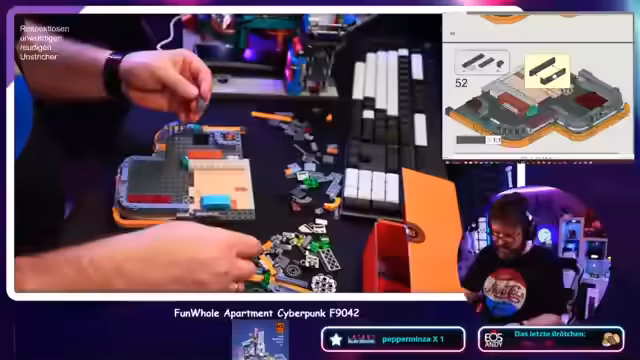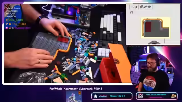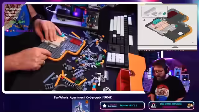 02:18:15Der Fokus verlagert sich auf den Aufbau eines umfangreichen LEGO-Modells, eines sogenannten Cyberpunk-Hauses. Dabei werden zahlreiche Bauteile und Verbindungen besprochen. Der Streamer stoßt auf einige Schwierigkeiten, unter anderem ein fehlendes und zu kurz erscheinendes Kabel. Es gibt auch eine Diskussion über ein alternatives Bauteil mit dem Code 'S', das jedoch ebenfalls nicht passt und die Verwirrung verstärkt.