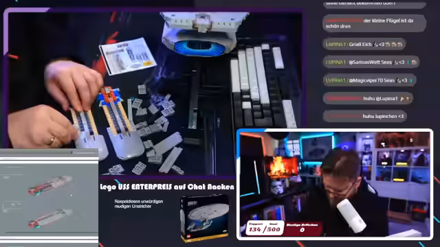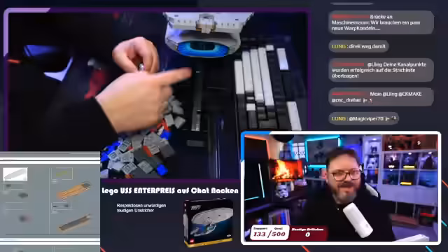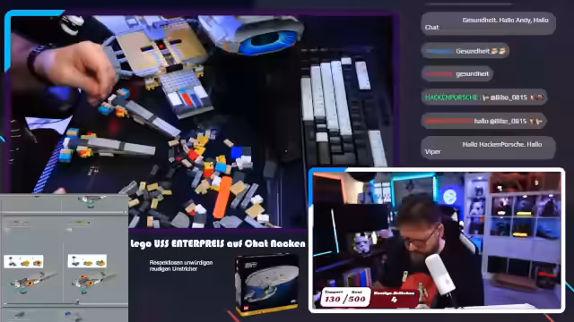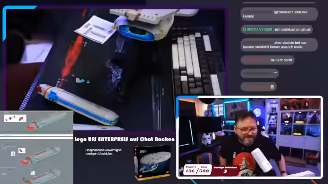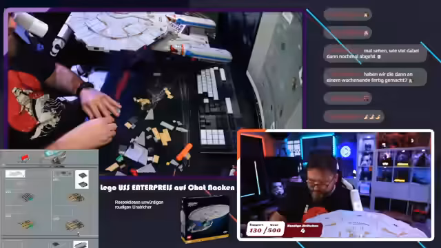 00:23:12Der Stream beginnt mit dem Bau des Lego-Sets der USS Enterprise. Der Streamer ist hochmotiviert, das Projekt fertigzustellen und berichtet über den Stand nach dem ersten Bautag. Es werden die ersten Bauteile wie die Beine und die Gondeln der Enterprise zusammengefügt. Dabei erwähnt er, dass der Bau aus kurzen, übersichtlichen Schritten besteht, was er sehr angenehm findet. Ein gelegentliches Durchsprechen der Anleitung und das korrigieren von falschen Steinrichtungen ist Teil des Prozesses.