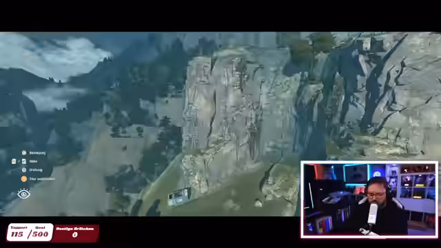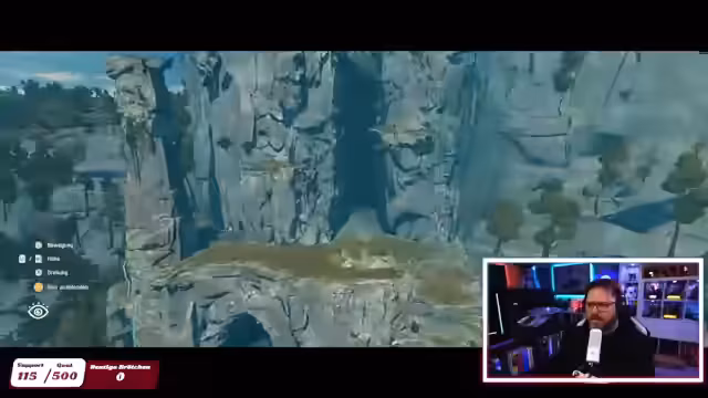 00:44:46Der Aufstieg erwies sich als körperlich sehr fordernd und der Streamer beschrieb, wie sich die Spielfigur förmlich abmühte und auch er selbst das Gefühl hatte, abzunehmen. Die Kletterei belastete sichtlich die Hände und Füße der Figur, was den Streamer zu der Erkenntnis brachte, dass dafür wohl Urlaub nötig sei. Das Sammeln von Ressourcen wie Energiegummis, Essen und dem Nutzen von Muskelentspannungsmitteln wurde notwendig, um die schwindende Ausdauer zu regenerieren und das Weiterkommen zu ermöglichen.